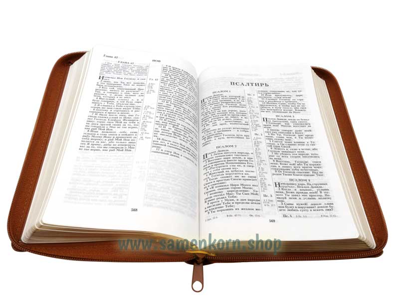 Синодальный перевод, стандартный формат. Pасположение текста: набор в 2 колонки, указатель параллельных мест посередине страницы.