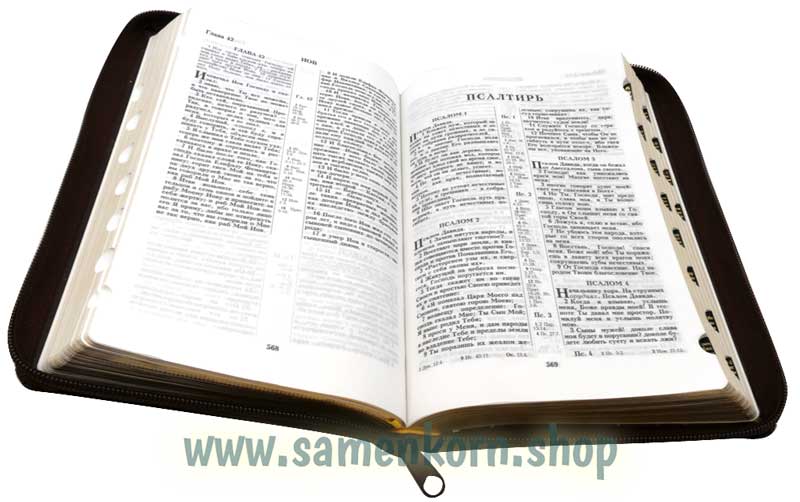 Синодальный перевод, стандартный формат. Pасположение текста: набор в 2 колонки, указатель параллельных мест посередине страницы.