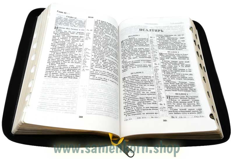 Синодальный перевод, стандартный формат. Pасположение текста: набор в 2 колонки, указатель параллельных мест посередине страницы.
