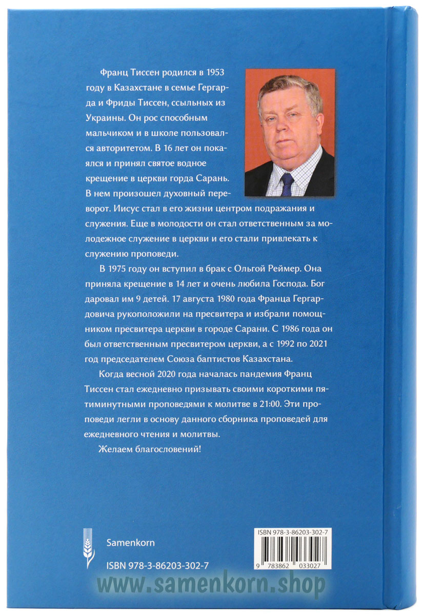 В 1975 году он женился на Ольге Реймер. Господь даровал им 9 детей. В 1980 году Франца рукоположили на пресвитера и избрали помощником пресвитера. С 1986 года он был ответственным пресвитером, а с 1992 по 2021 год – председателем Союза баптистов Казахстана. Когда весной 2020 года началась пандемия, Франц Тиссен начал ежедневно призывать к молитве в 21:00 в своих коротких 5-минутных проповедях. Эти проповеди легли в основу данной книги для чтения на каждый день.