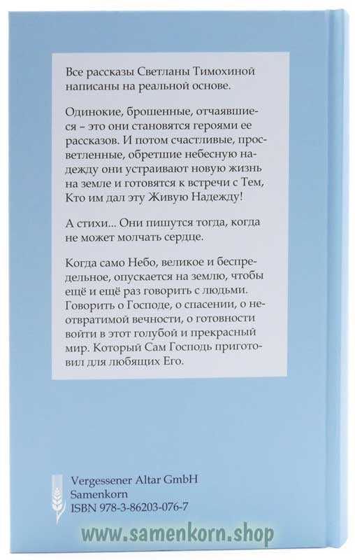 Все рассказы Светланы Тимохиной написаны на реальной основе. Одинокие, отчаявшиеся становятся героями ее рассказов. И потом счастливые, обретшие небесную надежду они устраивают новую жизнь на земле ... Стихи  говорят о Господе, о спасении, о готовности войти в Небо.